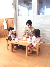 離乳食の子どもには、1人に1人がついて進めます。その後2人に1人がついて進めます。そして2歳児になると、盛りつけた後は最大6人今はコロナの為アクリル板設置の為4人が一緒に食べている状態です。