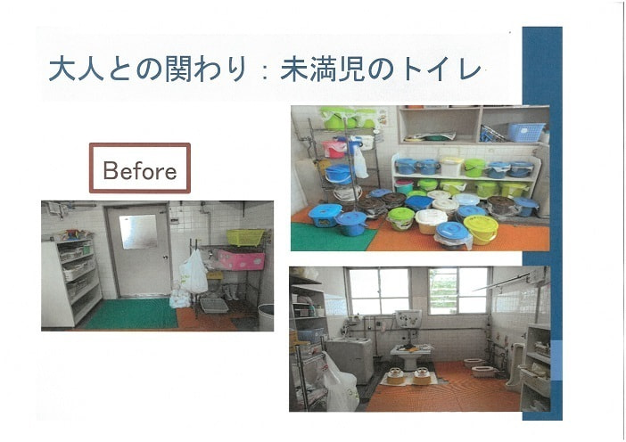姉妹園での話です。4年前にはじめて訪れた時、乳児のトイレがまるで物置のようでバケツが沢山並んでいました。1日分の汚れたおむつを個人のバケツに入れ各自が持ち帰る。ということでした。「エ~!毎日汚れたおむつバケツを買い物した食材と一緒に持ち帰っているんだ!!」