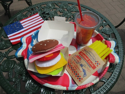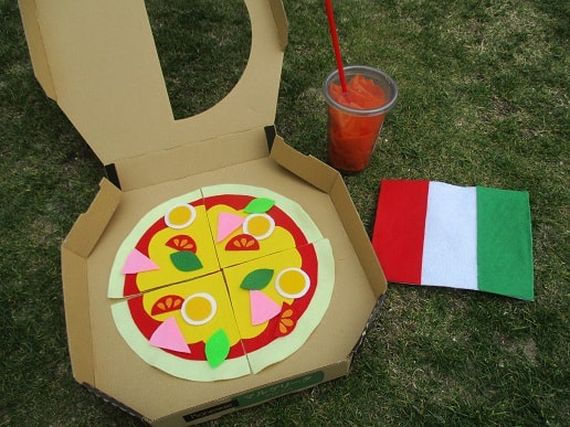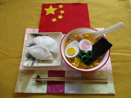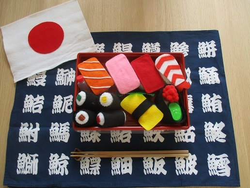多様性の受容という観点から遊びの中で異なる人種や文化を表す小道具&使える教材として色々な国の食べ物などを保育教諭がフェルトや布を使って手作りしました。