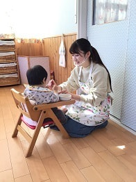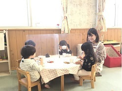 離乳食の子どもには、1人に1人がついて進めます。その後2人に1人がついて進めます。そして2歳児になると、盛りつけた後は最大6人今はコロナの為アクリル板設置の為4人が一緒に食べている状態です。