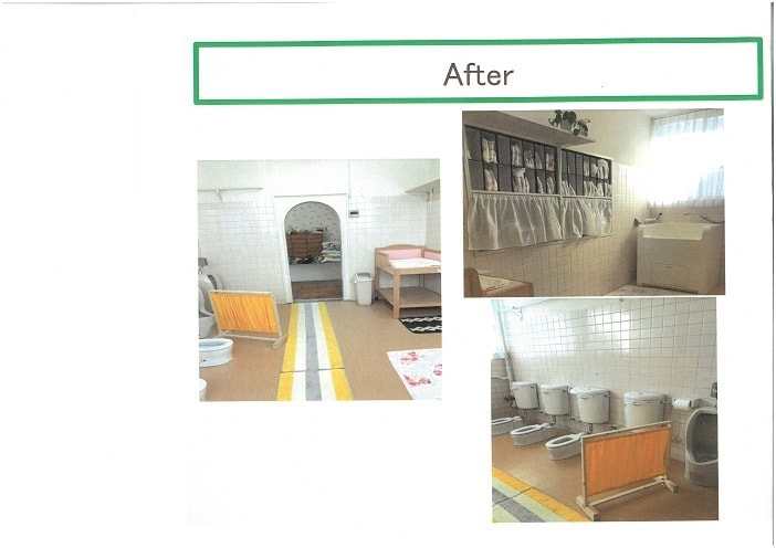 姉妹園での話です。4年前にはじめて訪れた時、乳児のトイレがまるで物置のようでバケツが沢山並んでいました。1日分の汚れたおむつを個人のバケツに入れ各自が持ち帰る。ということでした。「エ~!毎日汚れたおむつバケツを買い物した食材と一緒に持ち帰っているんだ!!」