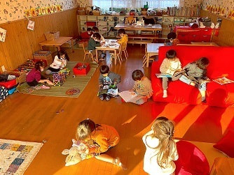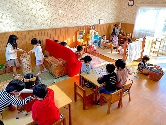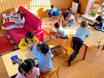 姉妹園との研修で、なんだか遊んでいる姿が少し違うように思う事が聞かれました。それぞれの子どもがそれぞれの遊びに集中している時間が長く部屋いっぱいに遊びが展開されています。