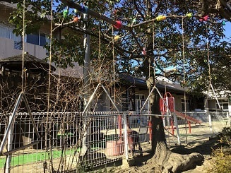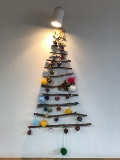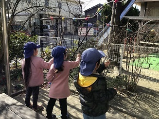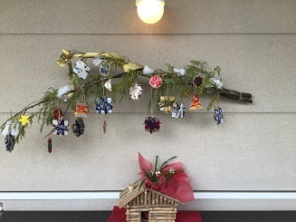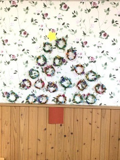 あるクラスの課業で園庭で剪定した木の枝を使ってクリスマスの飾りを作っていました。枝の長さを比べ、長い、短いの認識に繋げ、ツリーを形づくり、上に飾る星を作るのに、園庭から黄色いものを探して来てと外に探しに行く活動に繋げ、飾りにまつぼっくりに毛糸を巻いたりしていました。他のクラスでも紙の型に、毛糸を巻いて飾りを作っていました。巻くという作業から腕の動かし方、それぞれの器用さなども見てとれるようです。