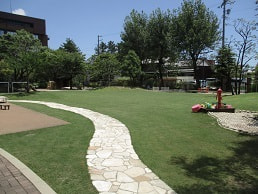 園庭の環境を考える時、自然には叶いませんが、出来る範囲で様々な素材の地面ということを考えています。砂、芝、クッション性のある地面、コンクリート、レンガのインターロッキング、アスファルト、木の根の出ている所、高低差のある所、石畳など、感覚を通して学んでいくこと、認知的な知識ではなく非認知的な感覚、体感を通して遊びながら体験しながら学んでいくことも大切にしています。