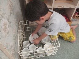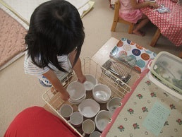 ところが、2歳児の食事を見てみると、食事の後自分の食器は自分でカゴに片付けるのですが、重ねて置く時もガチャンと音が出ないようにそっと積み重ねていました。置く場所も少し傾くようなら別の場所を自分で探して、そっと置いています。2歳児がちゃんと壊れないように自分で考えて置いている姿を見て、感動すらします。下手をすると大人の方が音を立ててガチャンと置いているかもしれません。