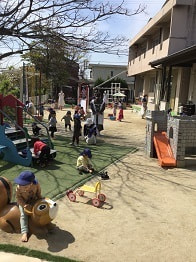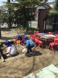 園には、三輪車専用の道があります。この道は、私が子どもの時にゴーカートとかに乗って楽しかったな、という思いがあり園庭にサーキットのようなコースを作ろうと思い、はじめは棒で線を引いて出来た道です。アスファルトを設置する時、地面の高低は慣らさずそのままにしました。その結果1カ所難所があります。坂でカーブになっています。はじめのうちは案の定そこでは子どもたちが良く転びました。しかし、体験するうちにそこではスピードを落とした方が良い事や、体の重心をずらしてバランスをとることなどを学んでいきます。また、大きな木の下では根が張って出っ張っている所もあります。危ないから手にした方が良いという考えもありますが、自園ではそういった所では自分で見て避けられる力を持って欲しいと考えています。