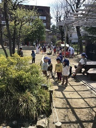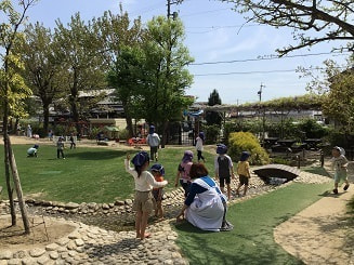 見守られながら自由に遊べるということは素晴らしいことですが、この時期はまだ肌寒く着替えの準備も十分ではないので、ある程度のルールを伝えることは必要です。ドボンと入ってしまう子は、夢中になると周りが見えにくい子が多く、その特徴を受容する必要もあるのですが、その中でルールをきちんと伝えていくバランスが大事なことだと思います。伝えた結果靴を脱ぎ、ズボンの裾をめくり、濡れないように気を付けて遊ぶ姿が見られました。